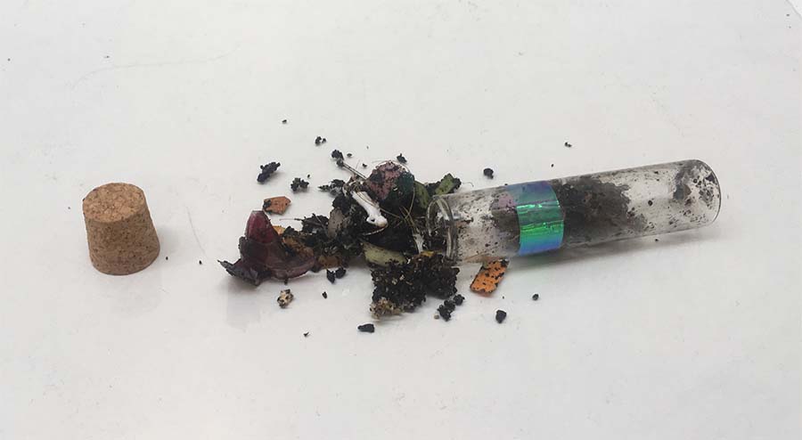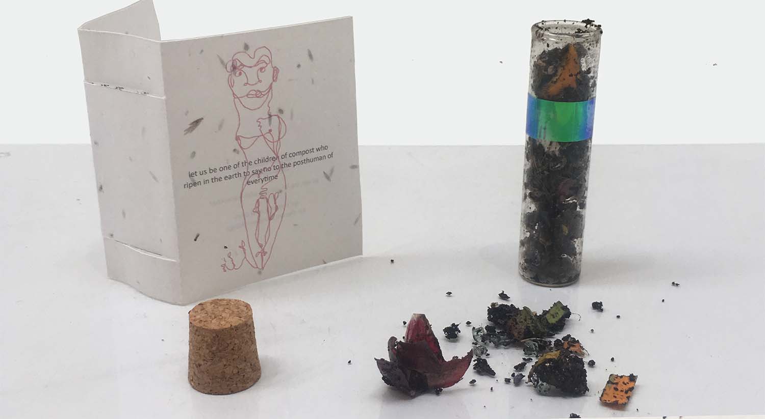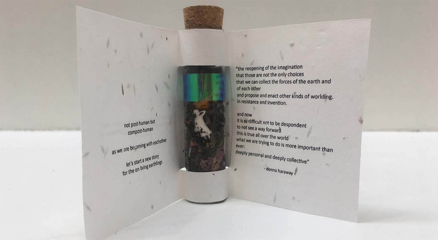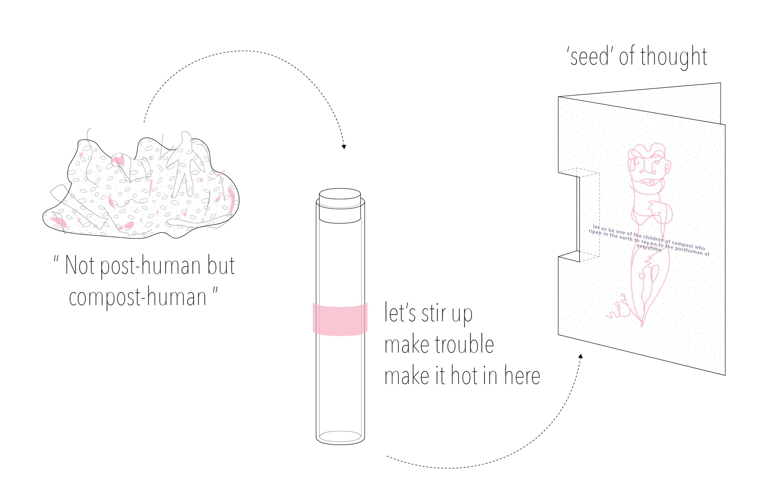 A small portion of compost containing traces from the Anthropocene was placed in a test-tube and a small perfume holder was fabricated using biodegradable seed paper. Together they form a strong reminder of Donna Haraway’s message (which is also printed the paper) and leave visitors with a small ‘scent’ of the performance.