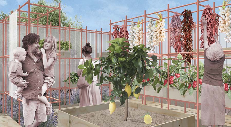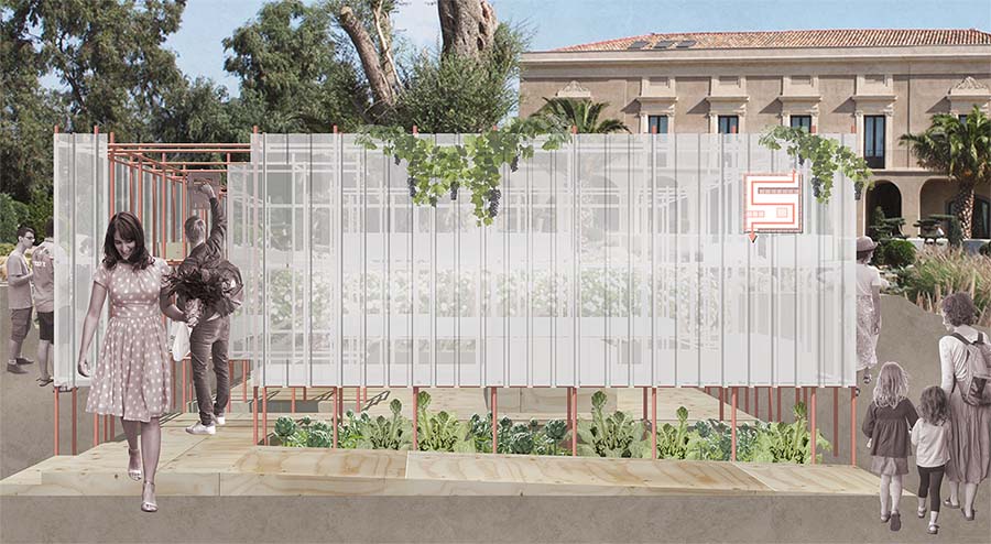 This project is part of a design contest for a garden expo in Sicily. The aim was to design a pavilion surrounding the theme ‘The productive garden’. ‘SUPER’ is a counterpart of the conventional supermarket where everything revolves around the mass consumption of food. At "SUPER", the outdoor supermarket, the type and amount of products are constrained by the specific season and growth rate before they can be harvested and purchased. This forces the customer to reflect on the value of food and the way in which it is produced. All used plants are edible and applied in the Sicilian cuisine including a lemon tree, garlic, aubergines and tomatoes.