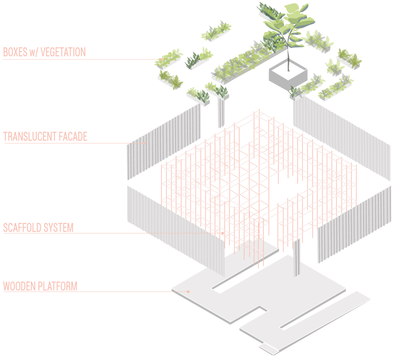 The proposed design embodies this message. From the outside the design displays patterns of a typical supermarket with practical and cost-efficient materials but hints of large plants show that it is all but a typical supermarket. Inside SUPER resembles the modern variant of an enclosed garden. At the entrance people can choose to either consume and grab a basket, or to contribute and grab a watering can.