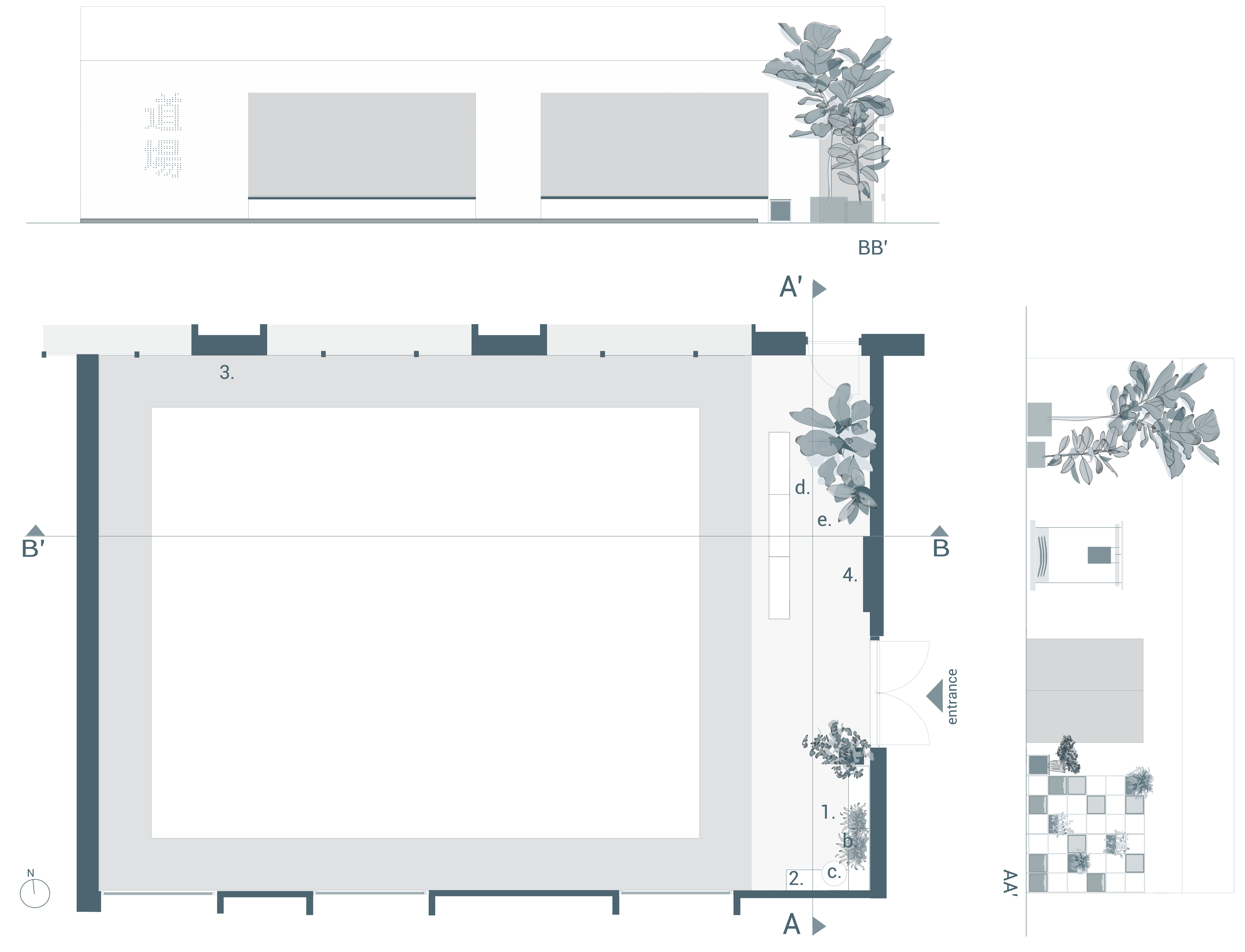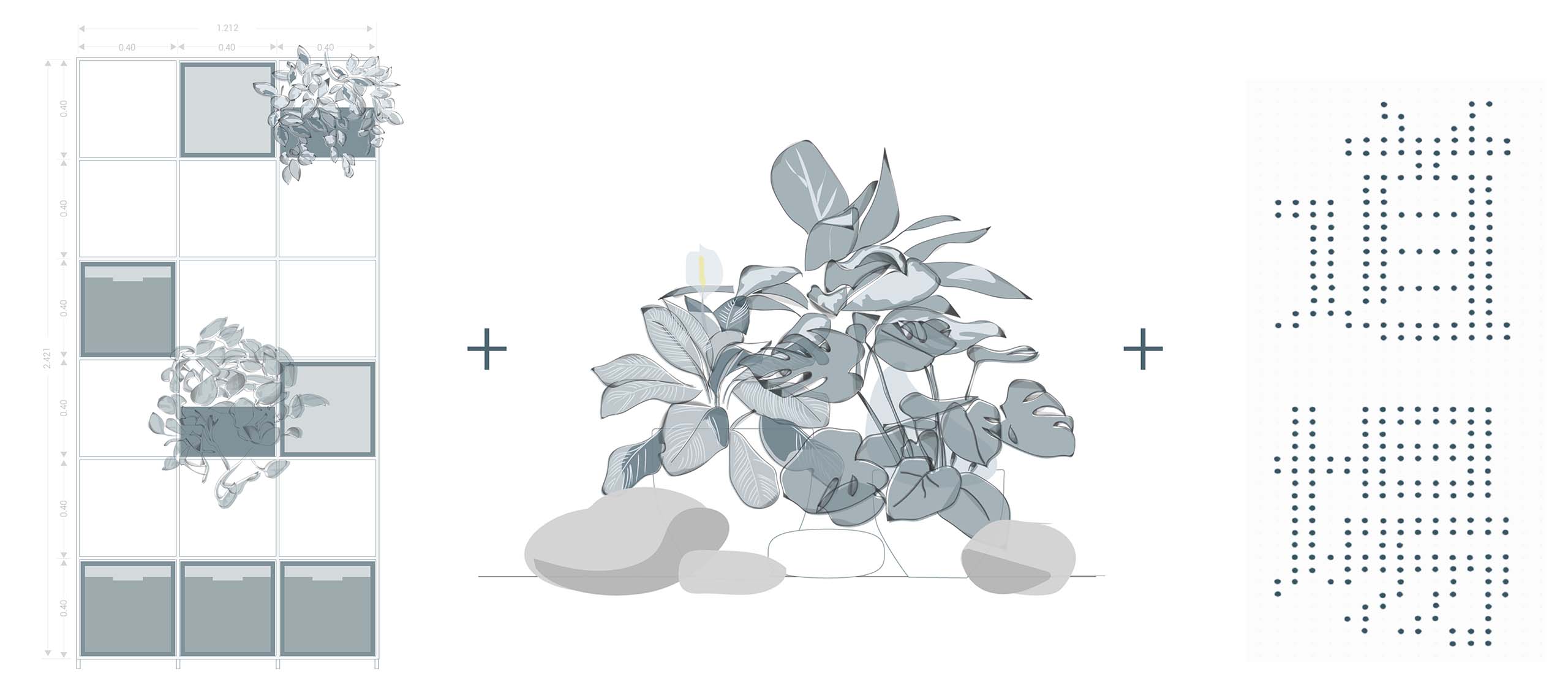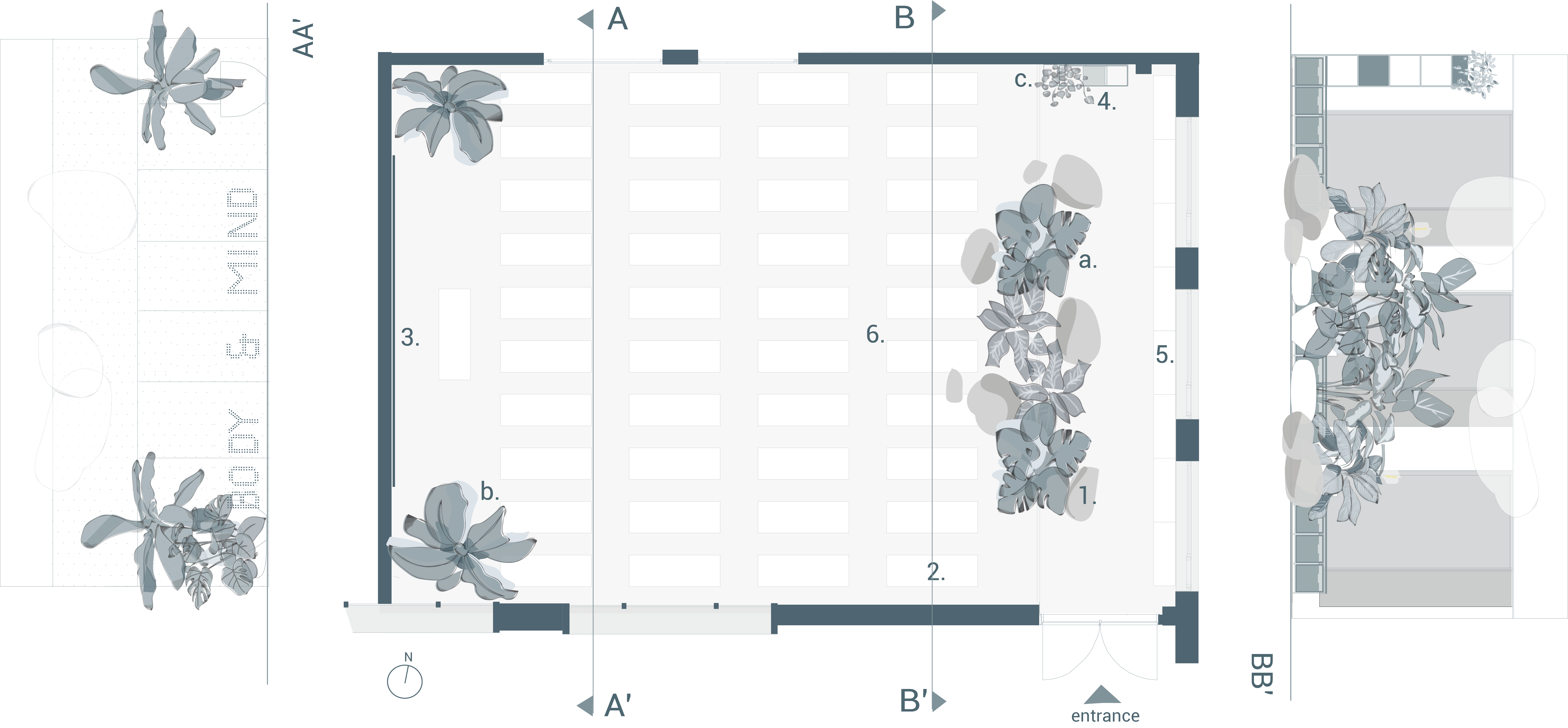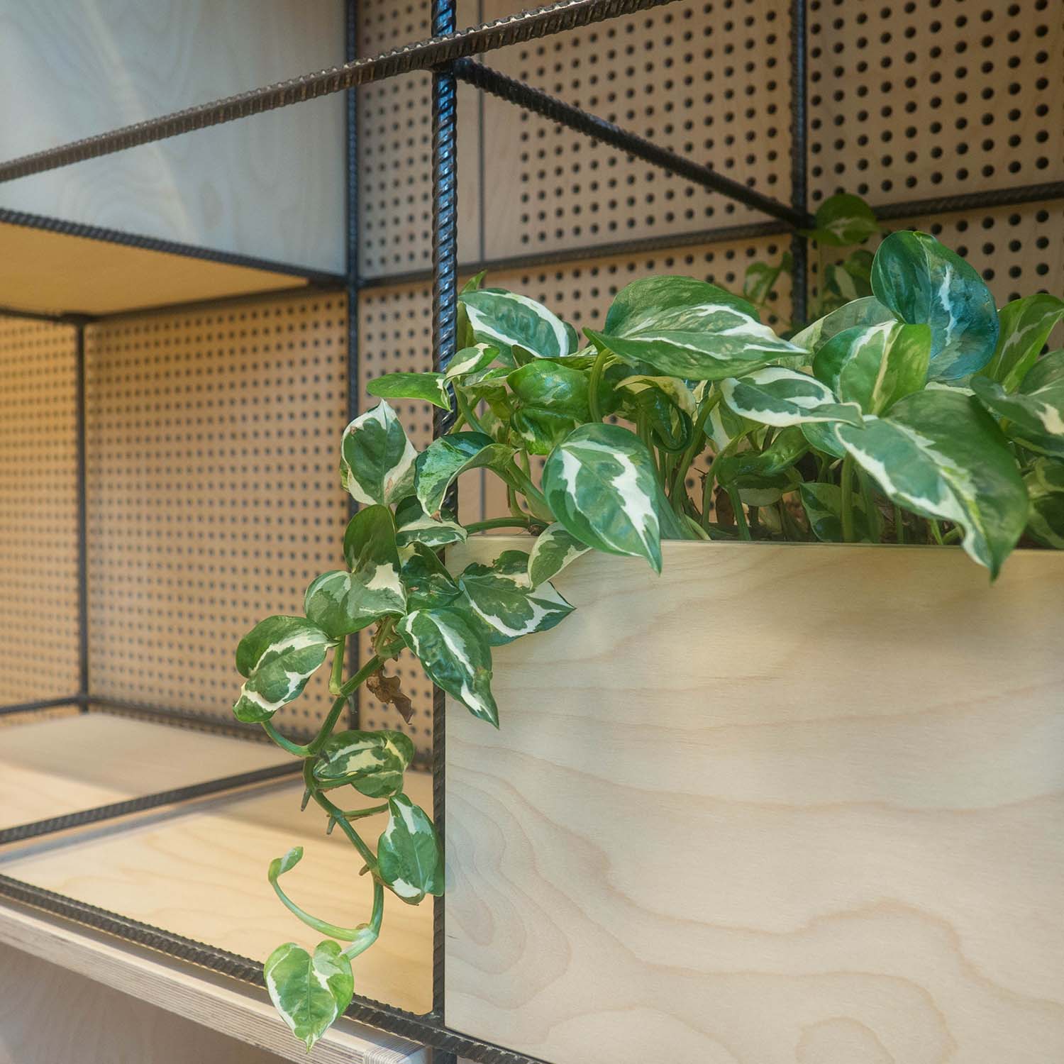 Functionality and continuity is achieved through deploying the FRAME series in every room which provides adaptive storage, seating and greenery. In every room a certain type of plant, lighting and signing was chosen and designed to reflect on the specific function while inserting a playful touch.